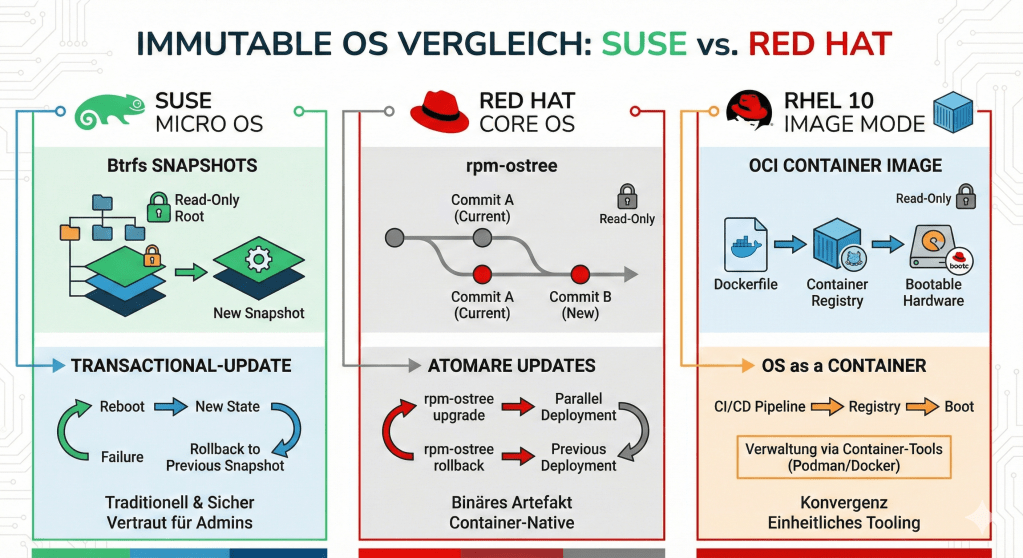 Hier kommen Immutable Operating Systems ins Spiel. In diesem Artikel vergleichen wir die zwei führenden Ansätze von SUSE und Red Hat.